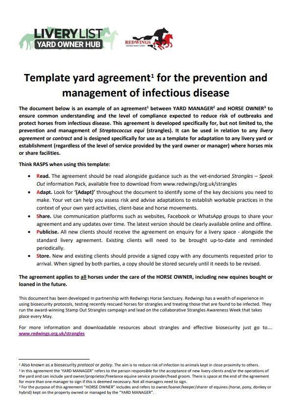 Find out more about introducing or improving the biosecurity protocols and planning for your yard by visiting the Redwings Strangles Hub, or the dedicated Biosecurity section of the LiveryList Yard Owner Hub