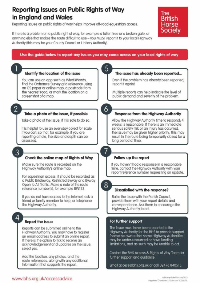 You can find out Road Safety Guidance here on the Yard Owner Hub, including the useful BHS guidance on various aspects of riding on and off the roads, as well as their Reporting Issues on Public Rights of Way in England and Wales information.